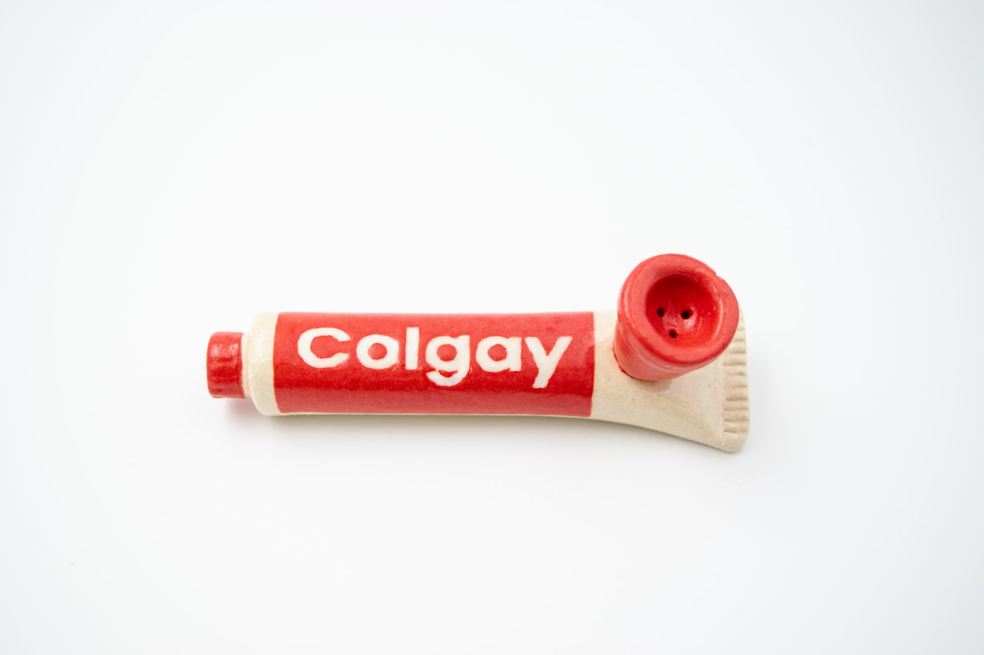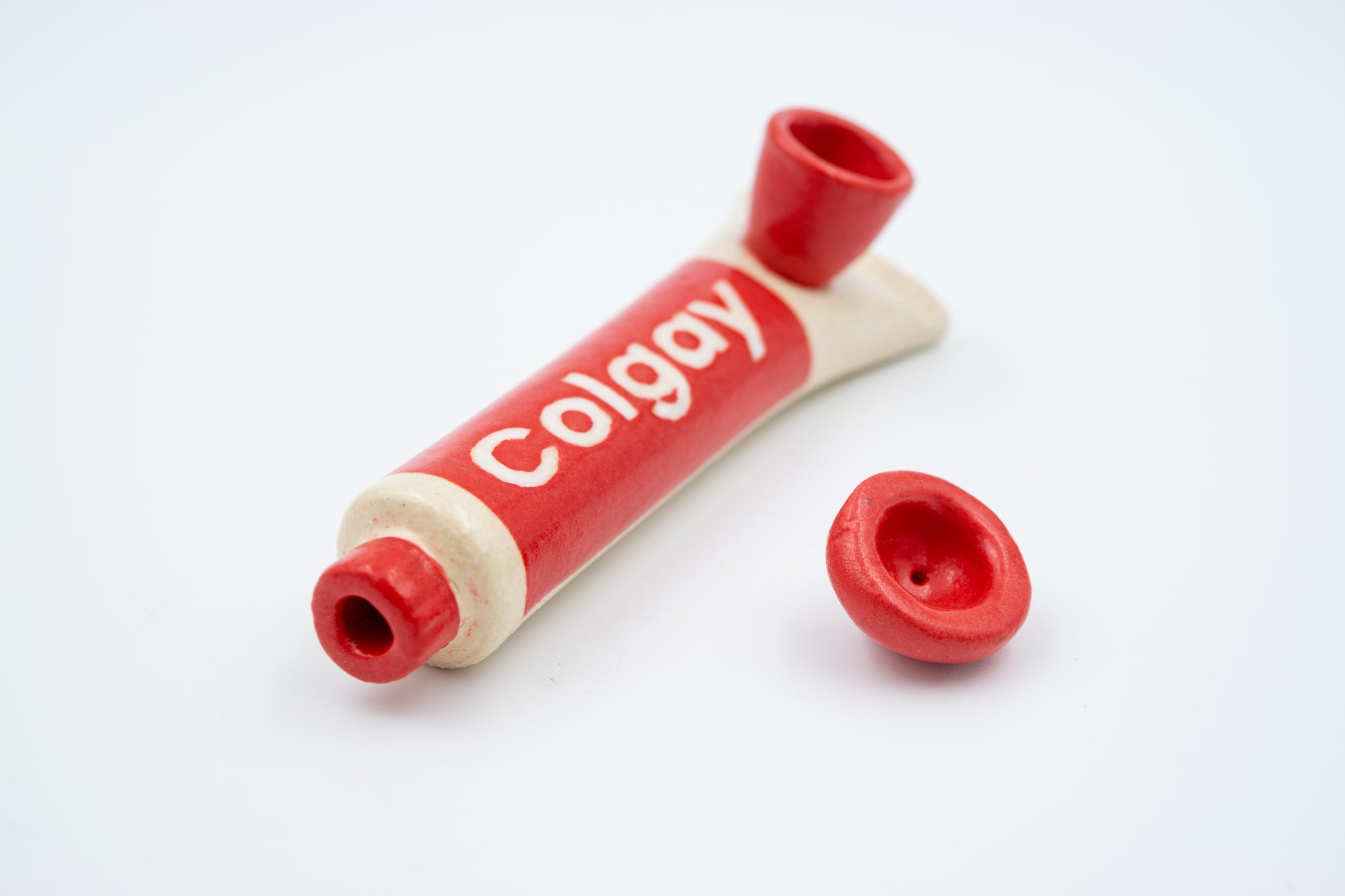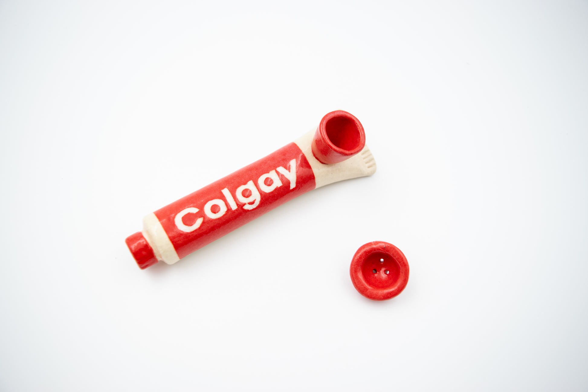 Hand-built ceramic pipe that looks like a toothpaste tube, like Colgate but gay.