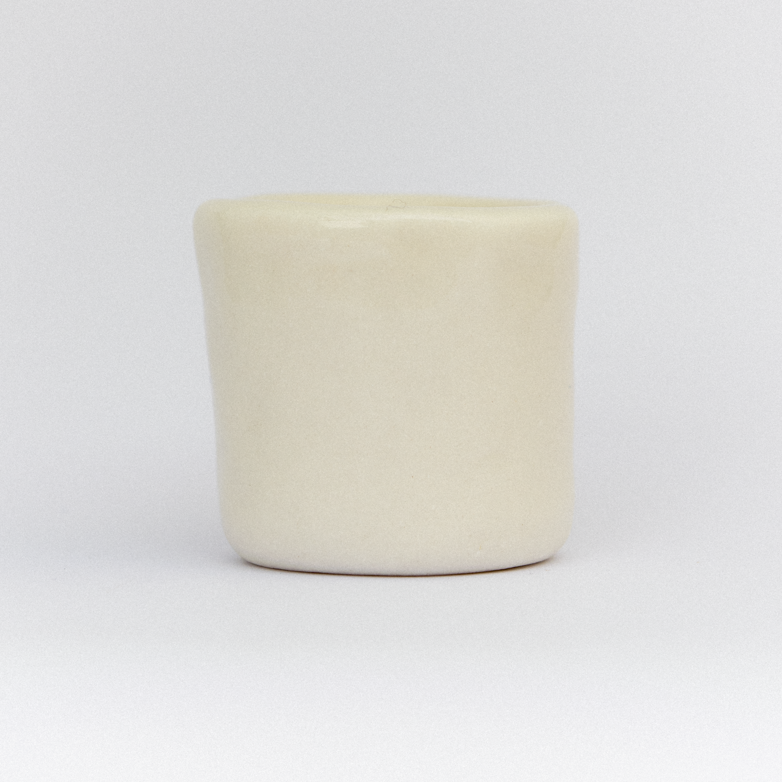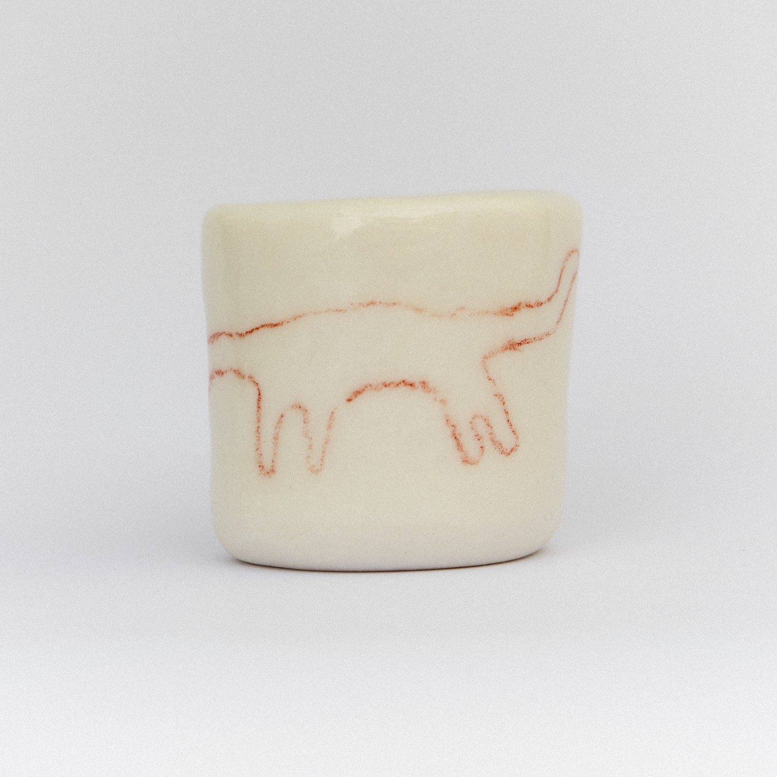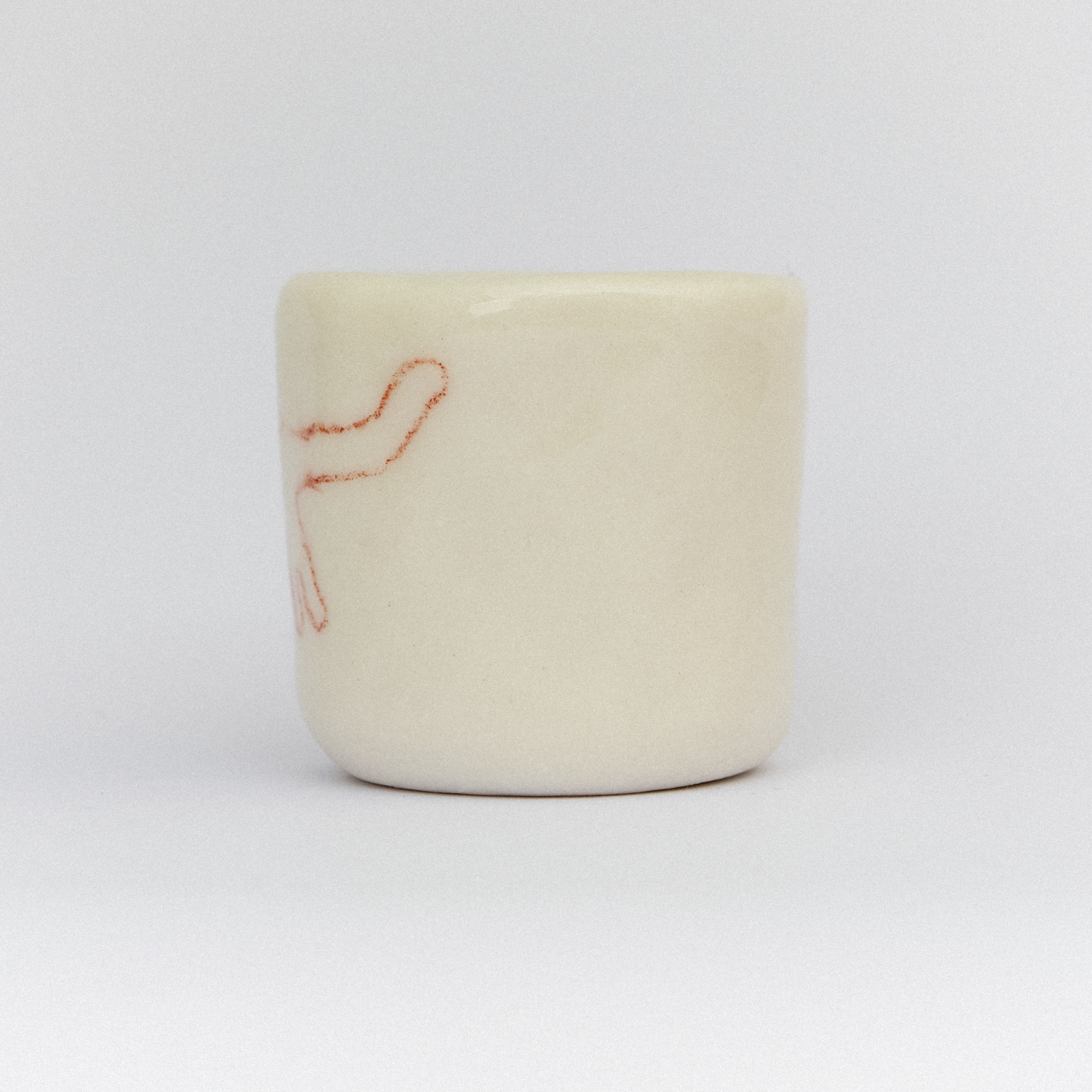This cup is wheel thrown from porcelain clay. Each has its own character with a simple line drawing that wraps around the cup.