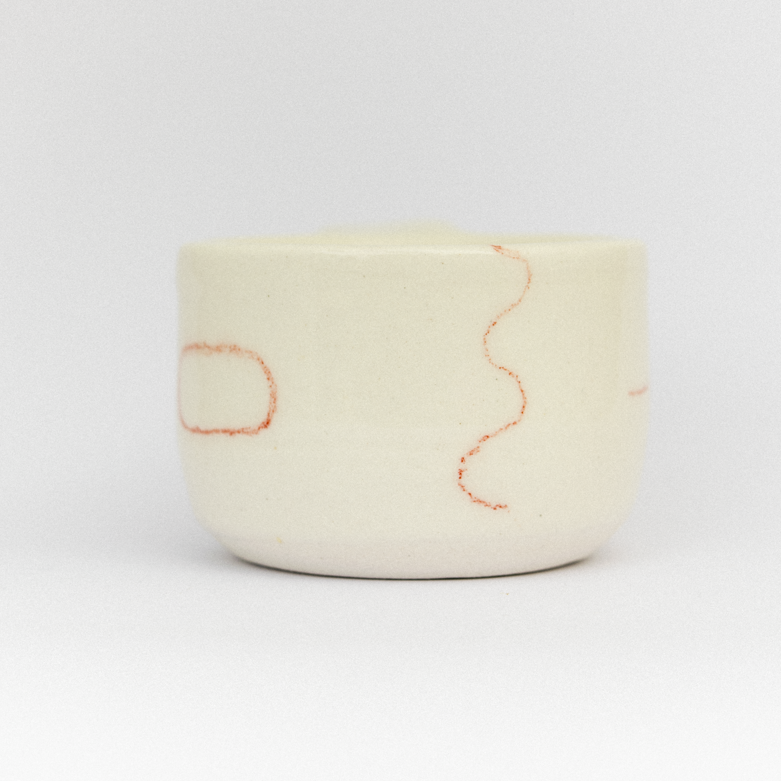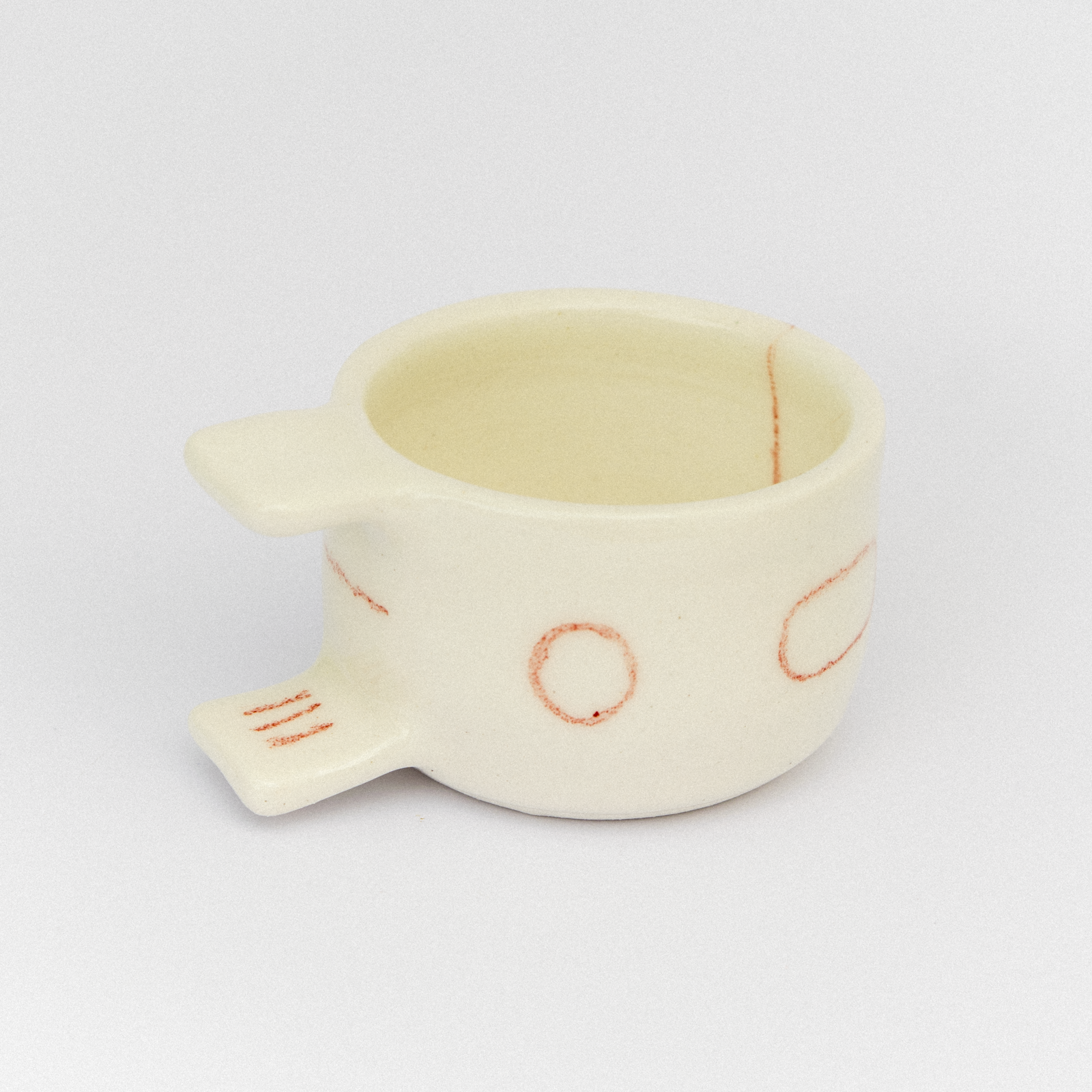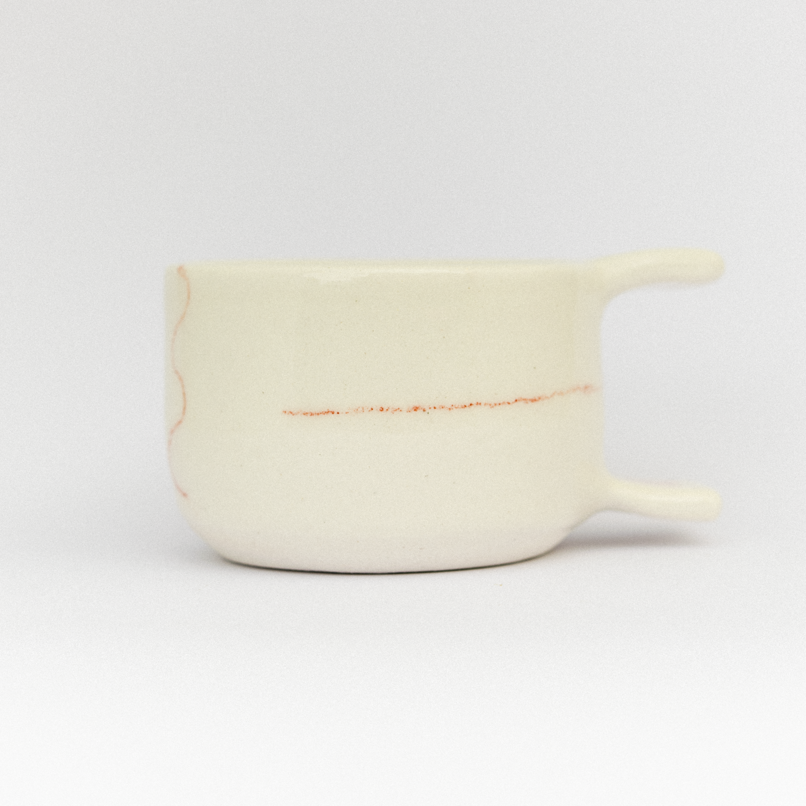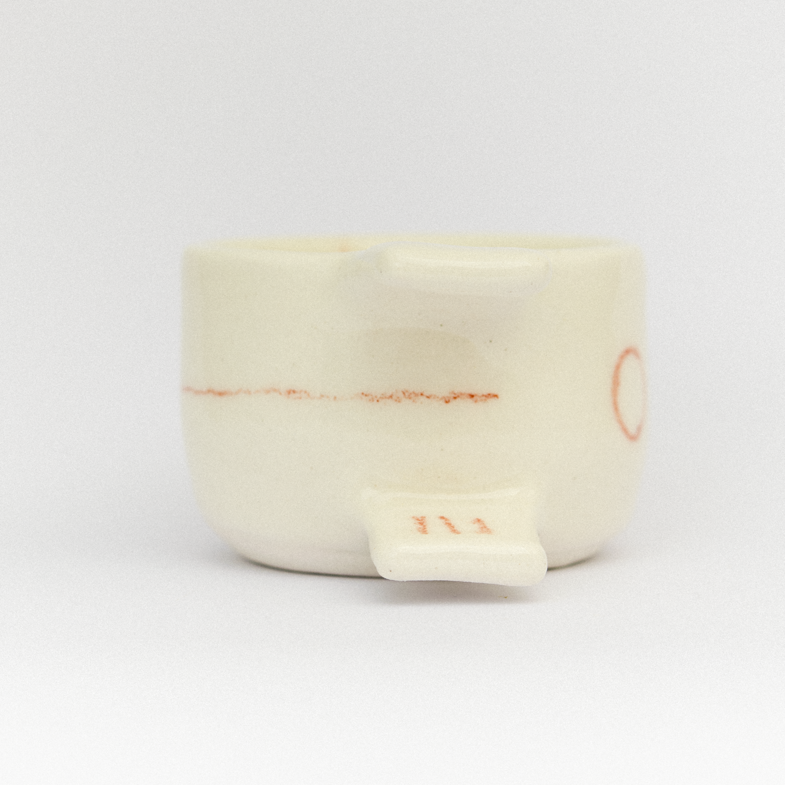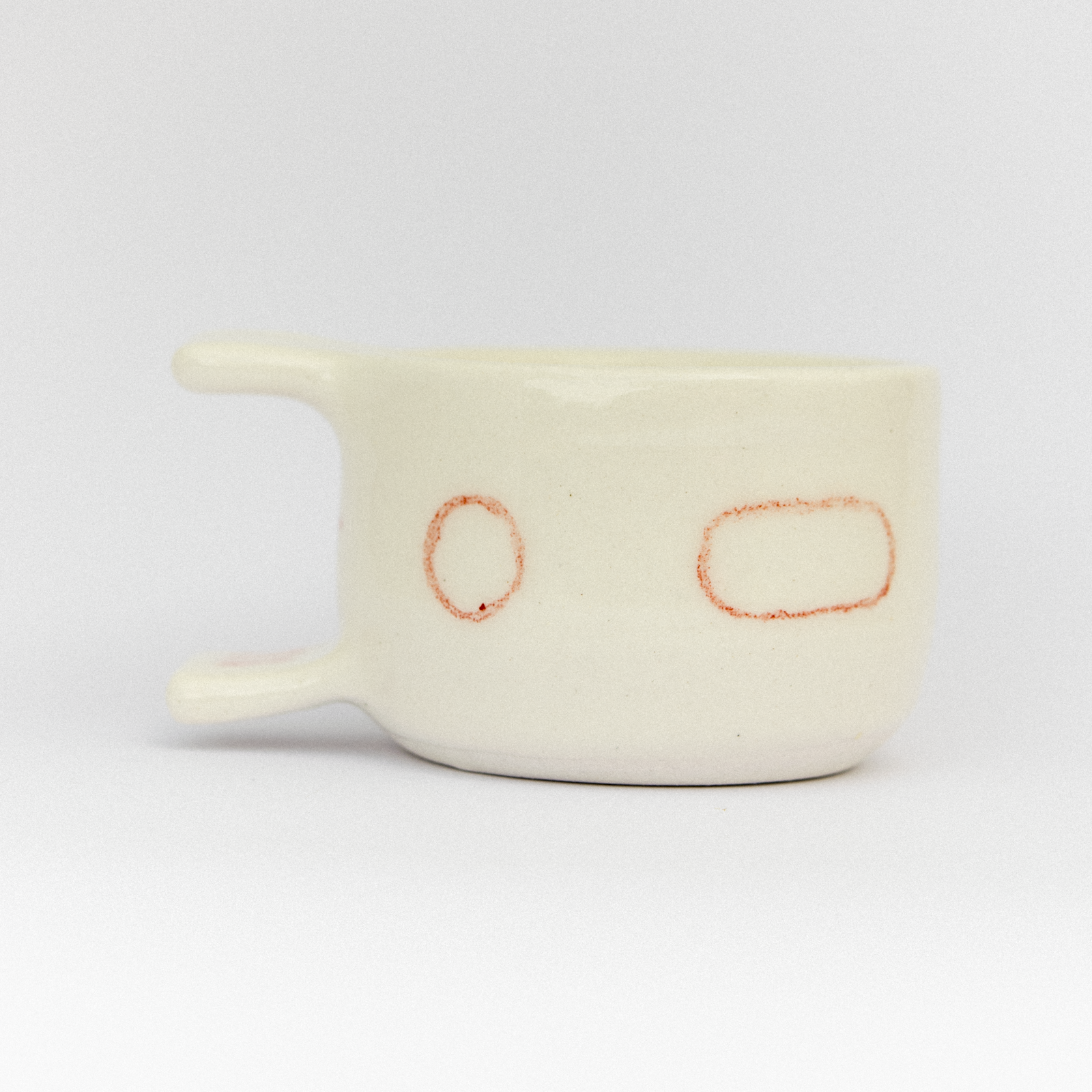 Hand thrown porcelain mug with double handles and red pencil doodles.