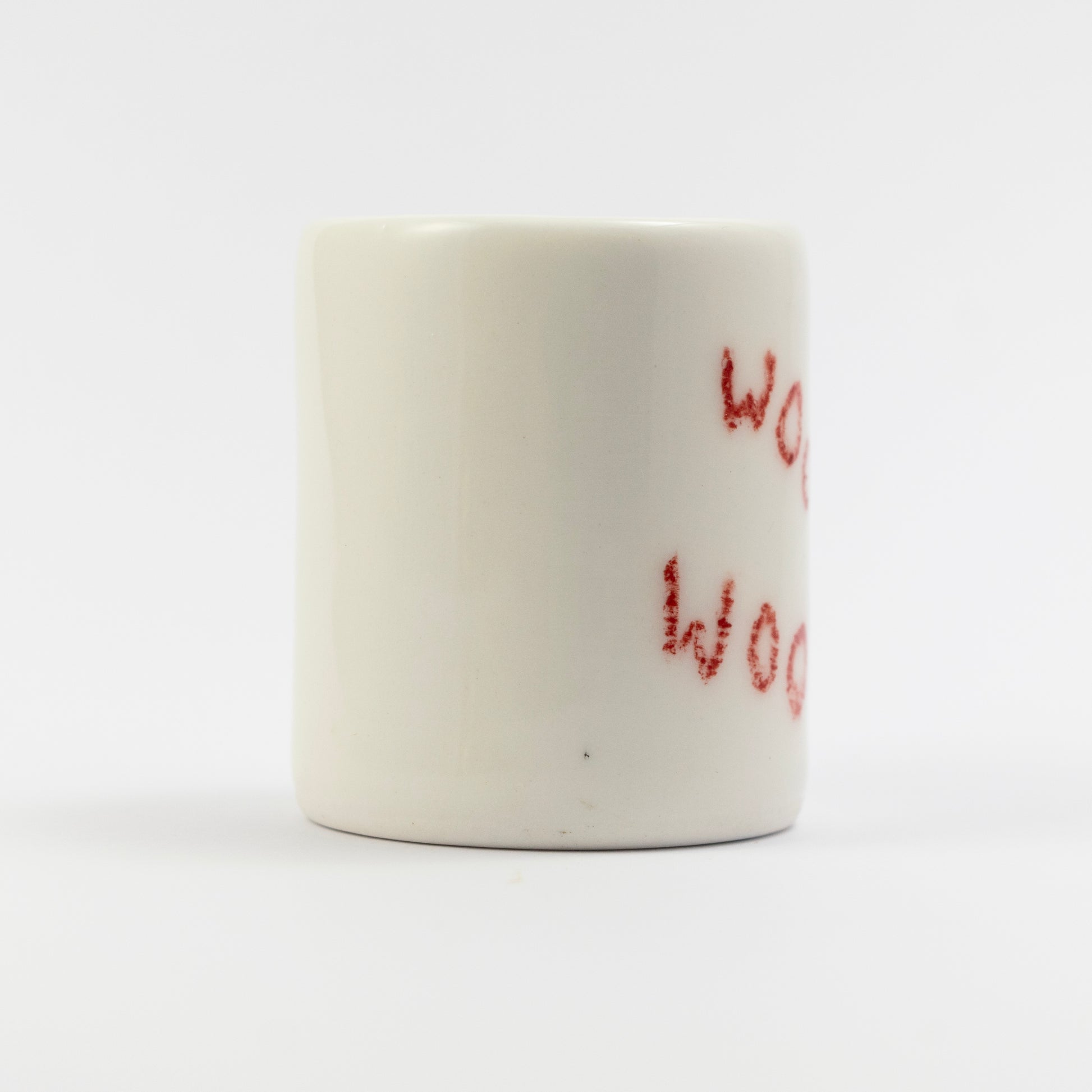 This shot glass is slipcast from porcelain using a handmade plaster mould. It features a red hand drawn duck and the words 'Woof! Woof'