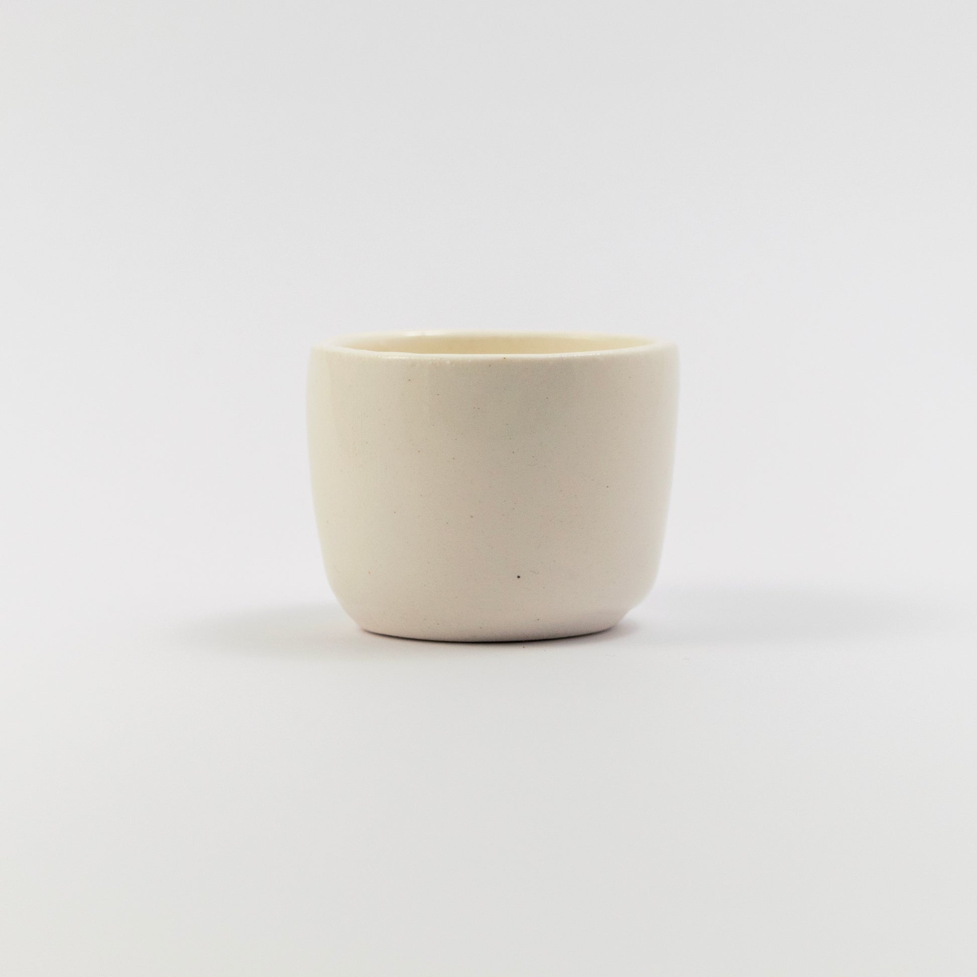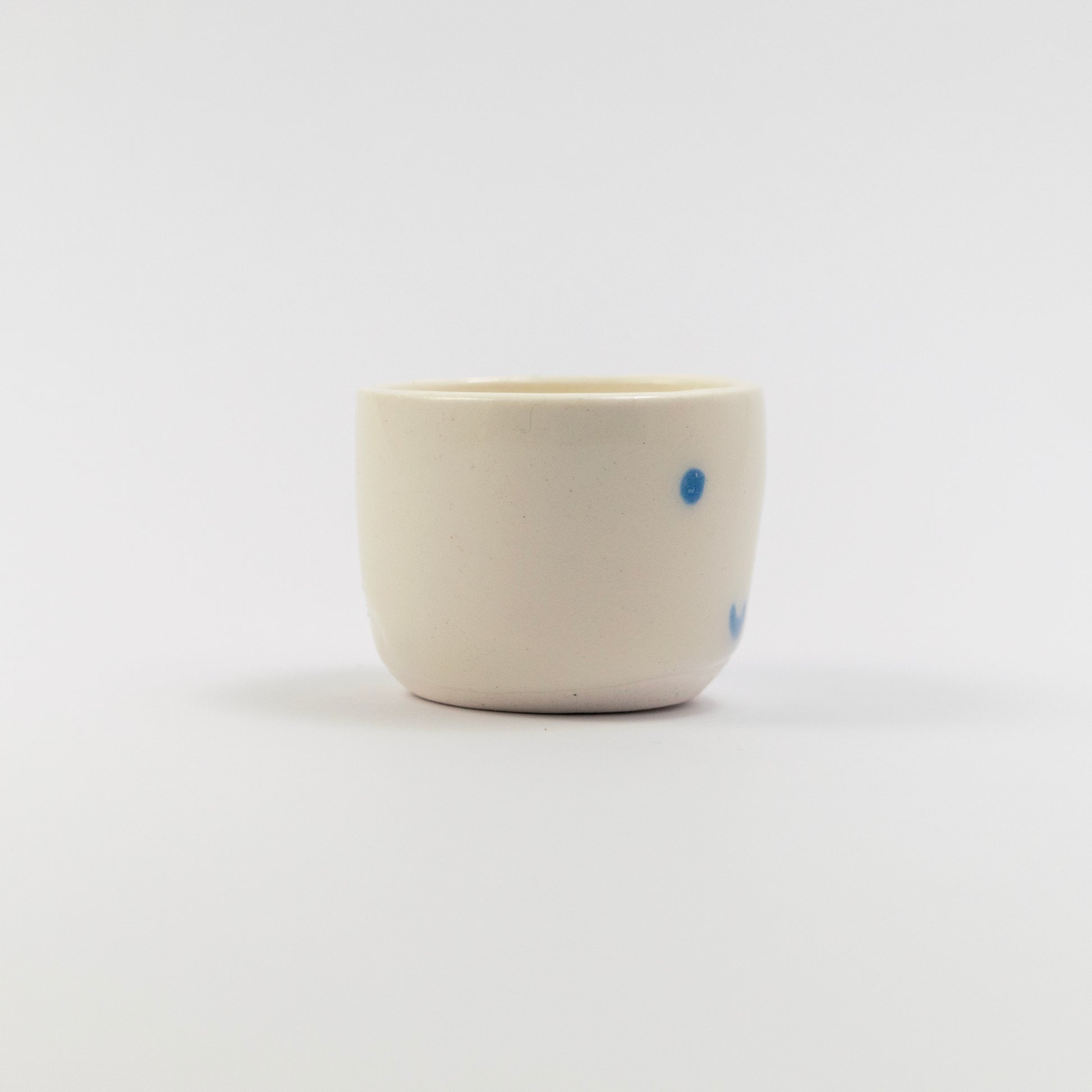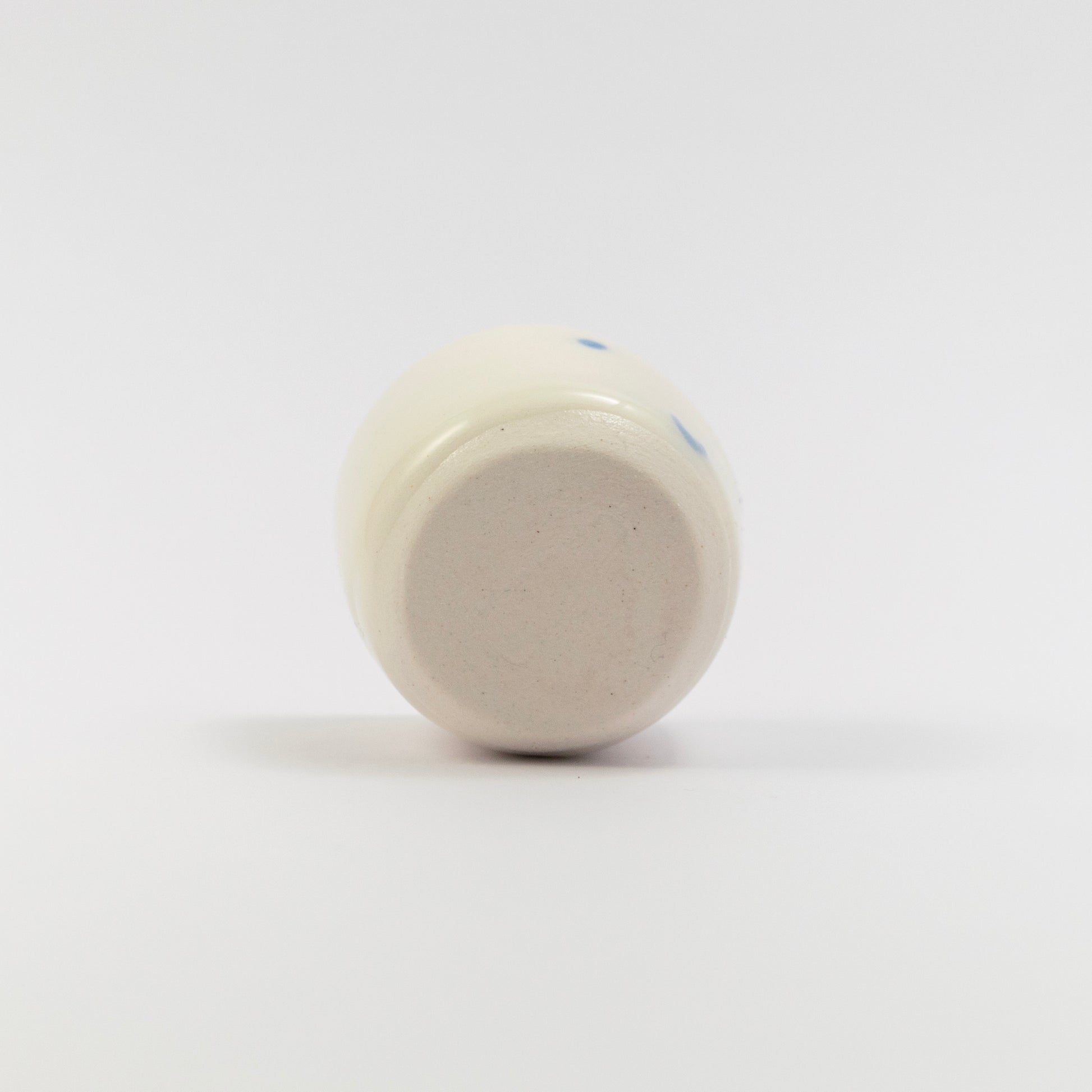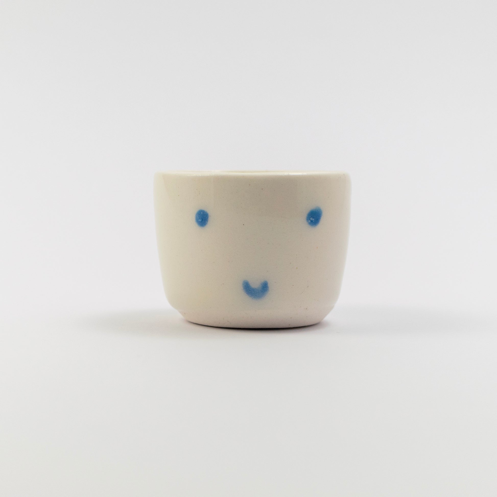 Wheel-thrown porcelain minicup with a hand-painted blue smiley face.