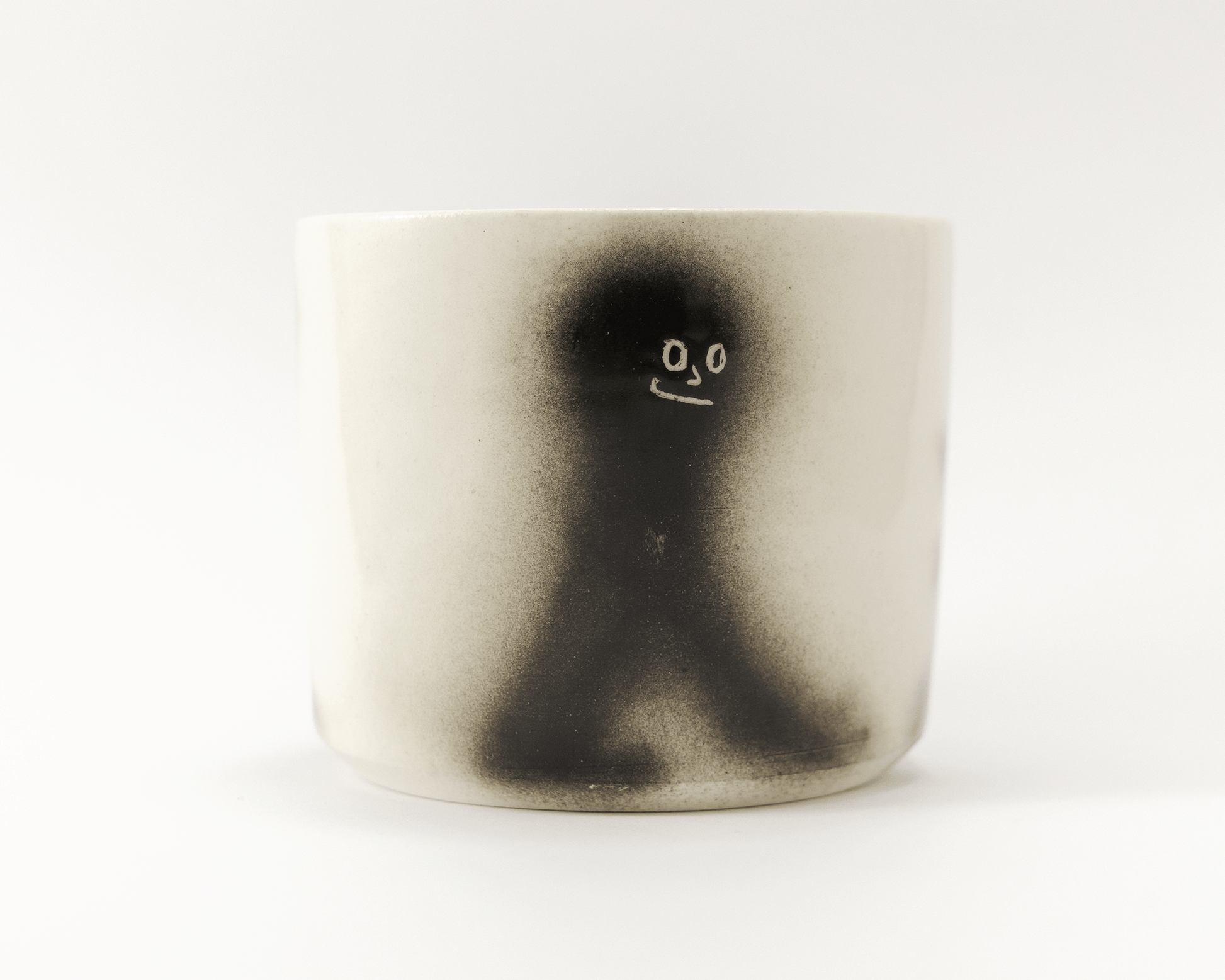 Hand thrown porcelain cup with black airbrushed figure design.