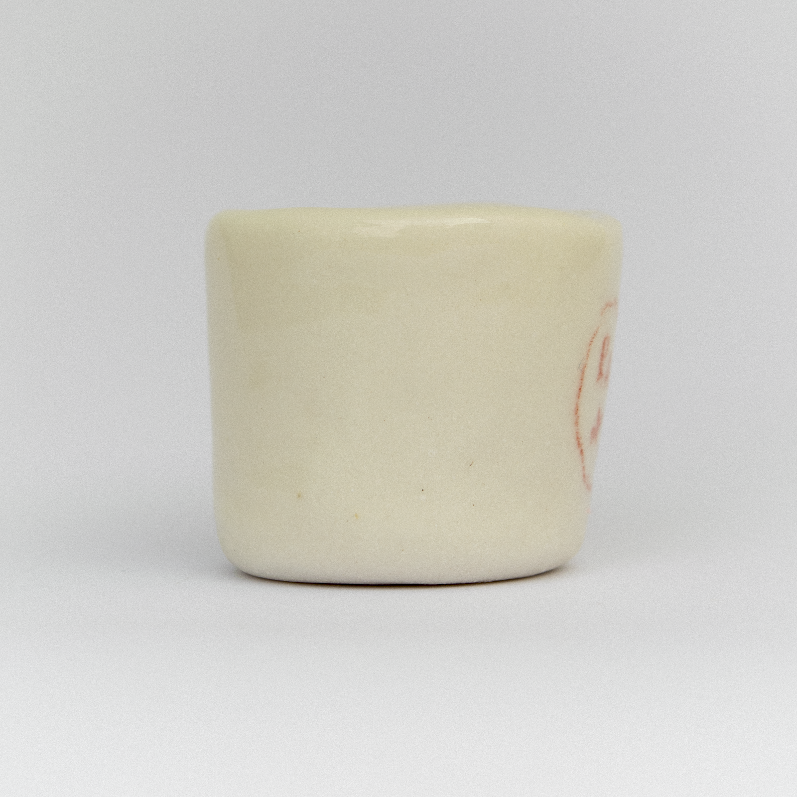 Hand thrown porcelain mini cup with red pencil drawing of a dinosaur saying 'RAWR XD'