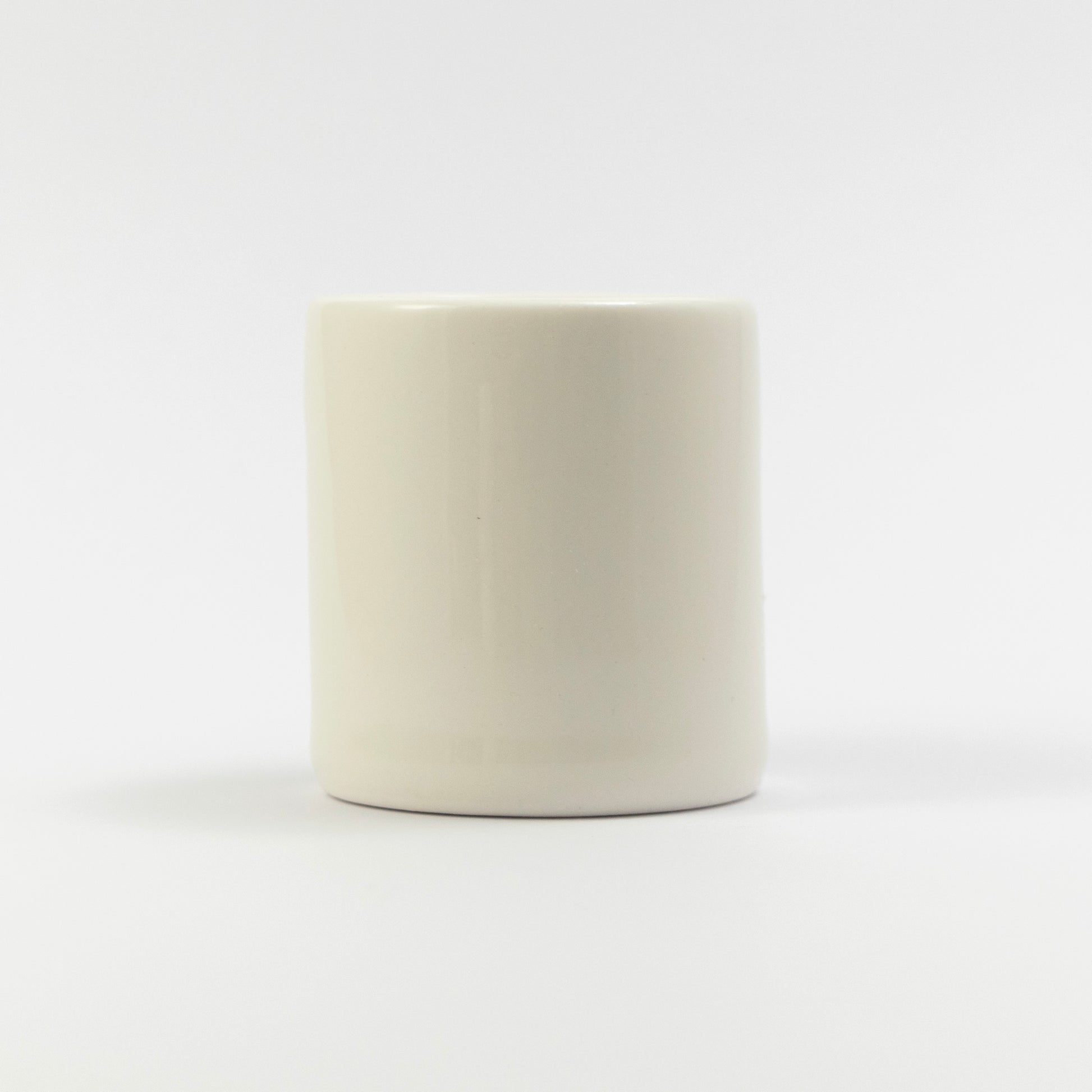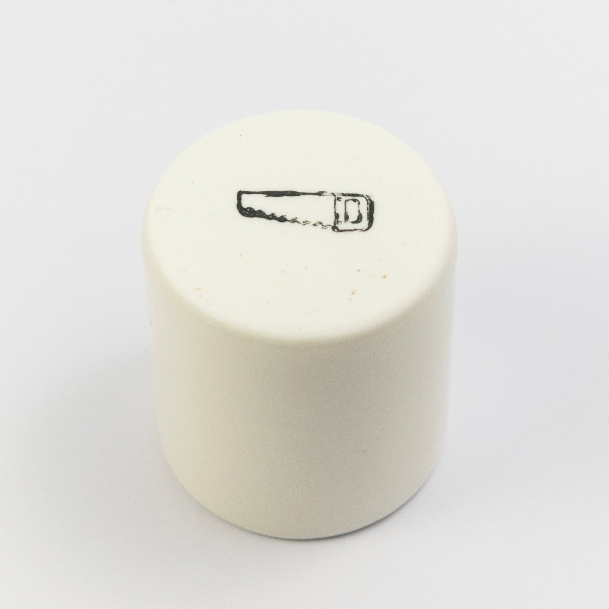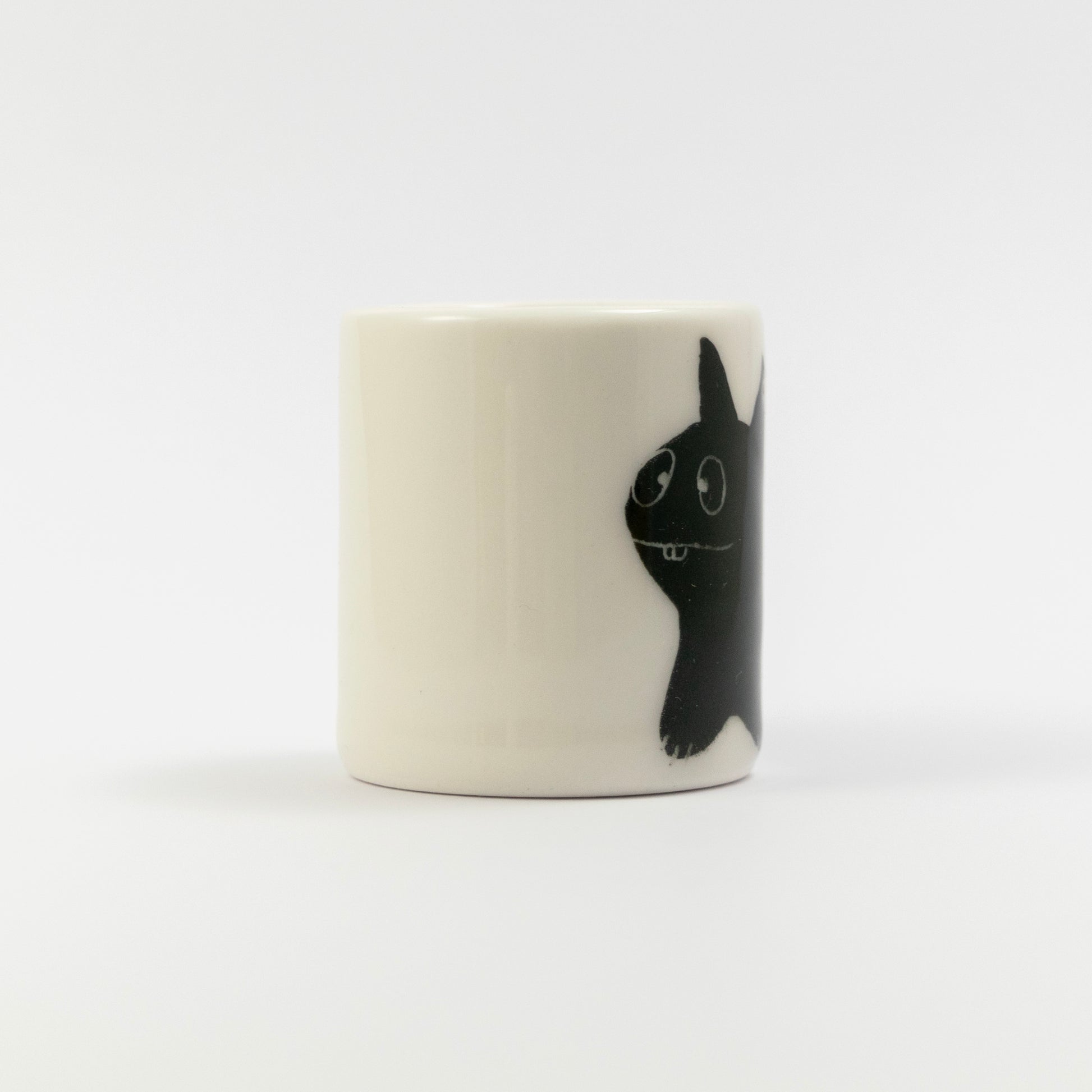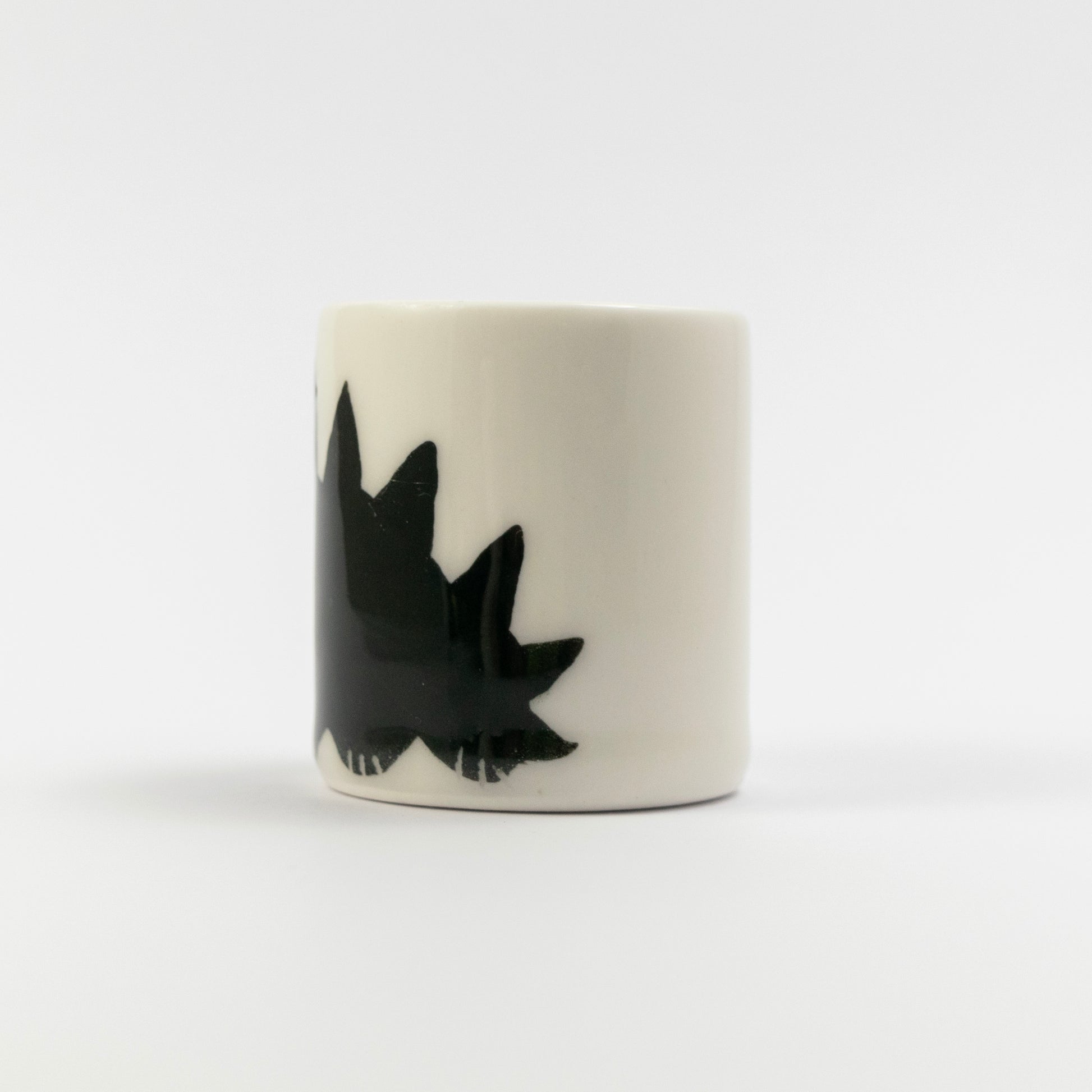 This small cup is slipcast from porcelain using a handmade plaster mould. It features a black hand-painted creature with rounded eyes and a spiked back, rendered in a simple, bold silhouette.